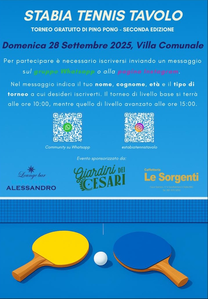 Partecipare al torneo è facile: basta inviare un messaggio sul gruppo WhatsApp dedicato oppure contattare la pagina Instagram @stabiatennistavolo.