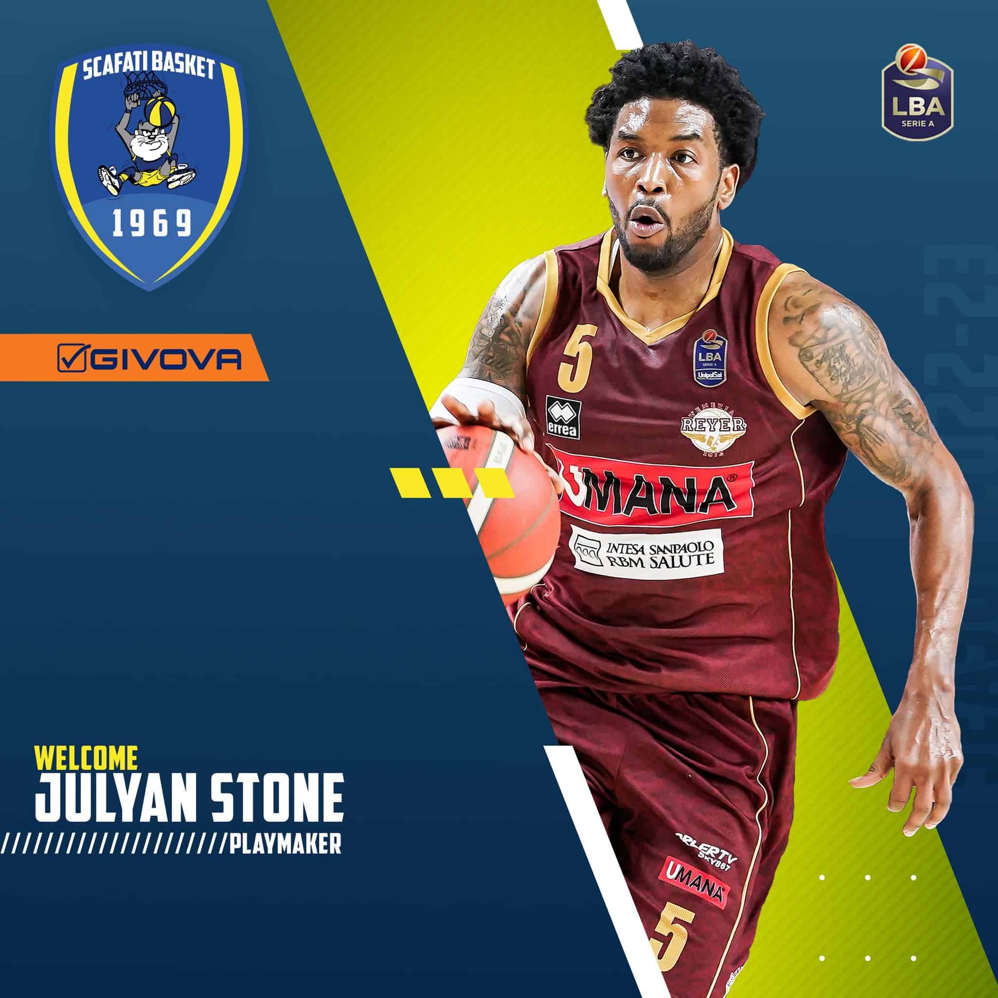 La Givova Scafati è orgogliosa di annunciare l’ingaggio per la prossima stagione agonistica 2022/2023 nel campionato di massima serie italiana, dell’esperto cestista statunitense Julyan Stone, playmaker totale, dotato di notevole prestanza fisica e di grandi qualità difensive, oltre ad una innata capacità di far girare la squadra e di una buona visione di gioco.